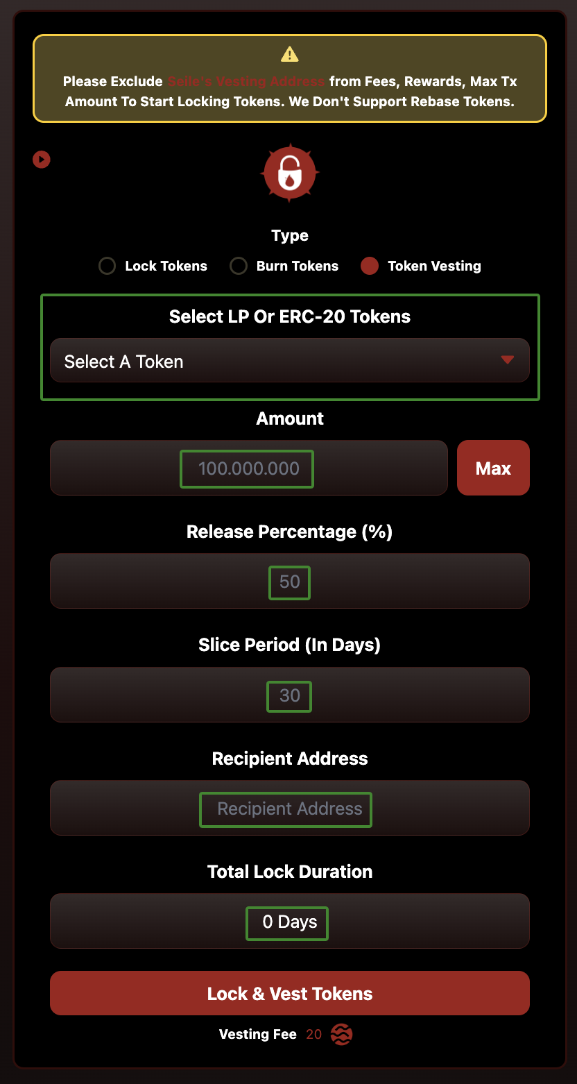 ## **Step 4: Choose Token And Vesting Details** <a href="#step-4-choose-token-and-lock-details" id="step-4-choose-token-and-lock-details"></a>